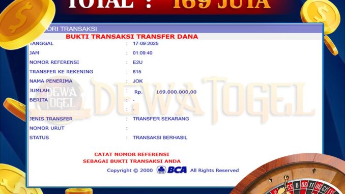 DEWATOGEL mengucapkan selamat kepada user id : FRA*** yang telah berhasil mendapatkan jackpot pada permainan LIVE CASINO DI DUEL DICE. Kemenangan sebesar Rp 169.000.000,-. telah dibayarkan LUNAS oleh pihak dewatogel kepada pemilik user id setelah yang bersangkutan mengisi formulir withdraw. Proses pencairan dana berlangsung sangat cepat hanya dalam waktu 5-10 menit sudah berada dalam rekening pemilik user id. Bukti transfer yang dapat anda lihat adalah bukti SAH / VALID yang langsung di dapatkan melalui bukti transaksi dari Bank yang digunakan untuk pengiriman dana pada rekening pemilik user id. Terima kasih kami sampaikan kepada para pengguna setia DEWATOGEL yang telah menggunakan situs kami, sebagai Bandar Terpercaya yang pastinya membayar semua kemenangan member hingga lunas. Apakah DEWATOGEL PENIPU ? Reputasi “DEWATOGEL TERPERCAYA” sudah sangat melekat. puluhan hingga ratusan ribu pengguna setia DEWATOGEL tetap menggunakan situs terbesar dan terbaik di Indonesia ini. Hapus rasa was-was dan khawatir anda, kemenangan anda berapapun PASTI dibayarkan hingga lunas.
